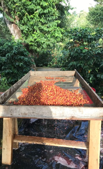 Honey Aufbereitung: Auch in diesem Fall werden die gepflückten Kirschen vor Ort auf Las Flores entpulped. Jedoch geht diesem Vorgang ein Schritt voraus: Die ganzen Kirschen werden zunächst im Wasserkanal "gefloatet", damit sich die leichten, minderwertigen Kirschen von den schweren, tollen Kirschen trennen. Die schweren Kirschen befreien wir sodann von der Haut und Teilen des darunter liegenden Fruchtfleisches. Ein Teil des Fruchtfleisches klebt jedoch noch am Kirschkern. Und das bleibt auch so. Jetzt bringen wir ihn zum Trocknen weg.