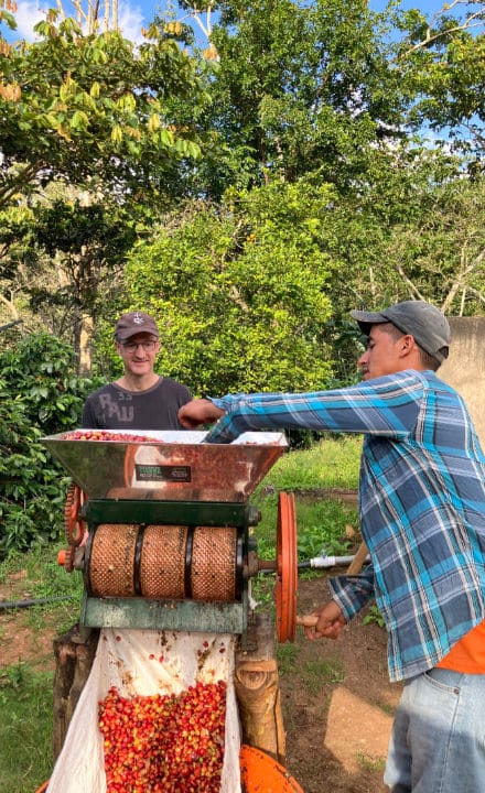 Natural Porto: Eine weitere Weinhefe, der wir nicht widerstehen konnten und die wir für einen Natural verwendet haben. Die aufgelöste Hefe kommt mit den Kaffeekirschen und Wasser für etwa 70 Stunden in ein Fass. Wir kontrollieren stets den ph-Wert und die Temperatur. Befinden wir, dass es genug ist, filtern wir die Kaffeekirschen heraus, packen sie in einen Sack und bringen sie zum Trocknen weg.
